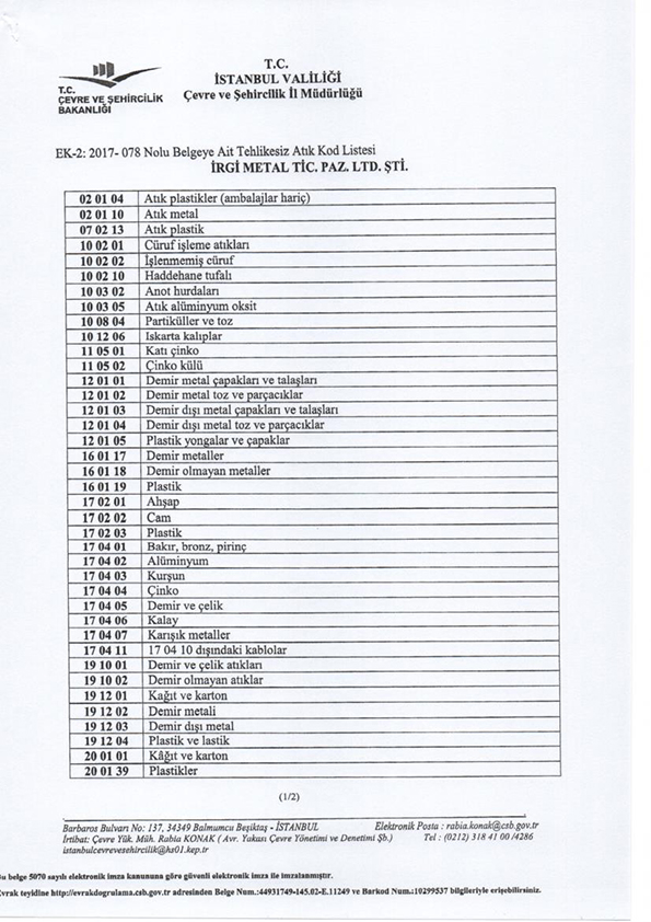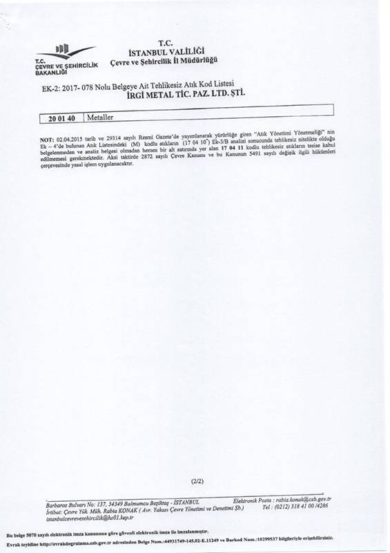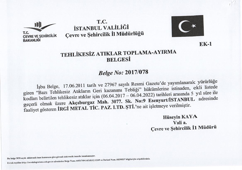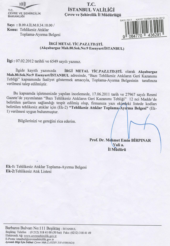 Firmamız "İstanbul Valiliği, Çevre ve Şehircilik İl Müdürlüğü - Tehlikesiz Atıklar Toplama-Ayırma Belgesi"'ne sahiptir.